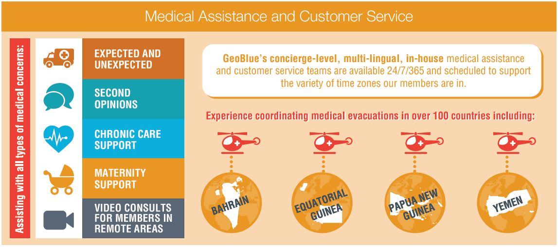 GeoBlue provides 24/7 multilingual medical assistance for routine care, chronic conditions, second opinions, and medical evacuations in over 100 countries.