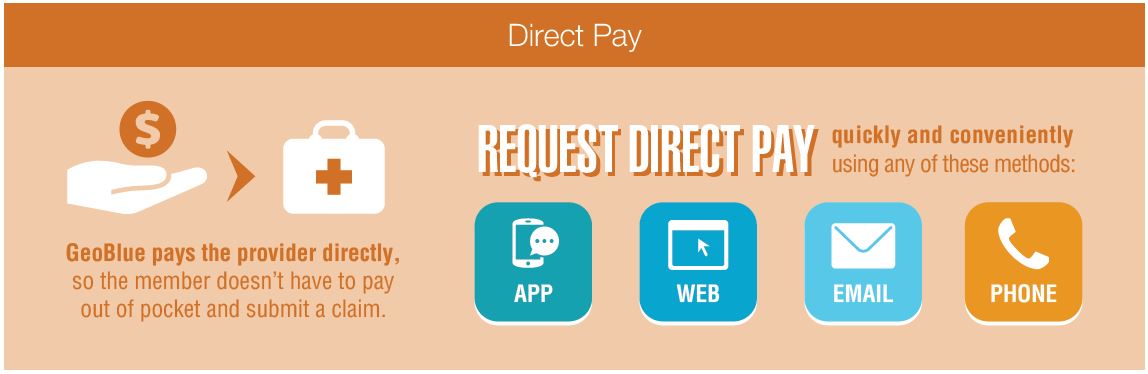 With Direct Pay, GeoBlue pays the provider so members don’t have to. It’s easy to request by app, web, email, or phone.